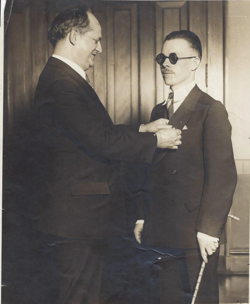 Col. James A. Moss, U.S. Army Retired, decorating Arthur P. Sewell with PAtirotic Medal in War Memorial, May 3, 1929 – Medal for outstanding service to the Flag written by his wife Elizabeth.