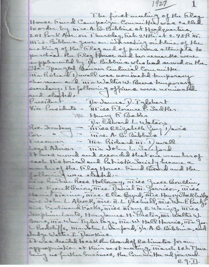 The meeting minutes read – “The first meeting of the Flag House Fund Campaign Committee was called to order by Mrs. A. B. Bibbins at headquarters, 201 Park Ave. on Thursday, Feb. 24th at 2:45 P. Mrs. Bibbins gave an interesting outline of the purchase of the Flag House and her remarks were supplemented by Dr. Bibbins who had served on the Star-Spangled Banner Centennial Committee. Mr. Richard Duvall was nominated temporary chairman and Mr. Walter W. Burns, temporary secretary. The following officers were nominated and elected: