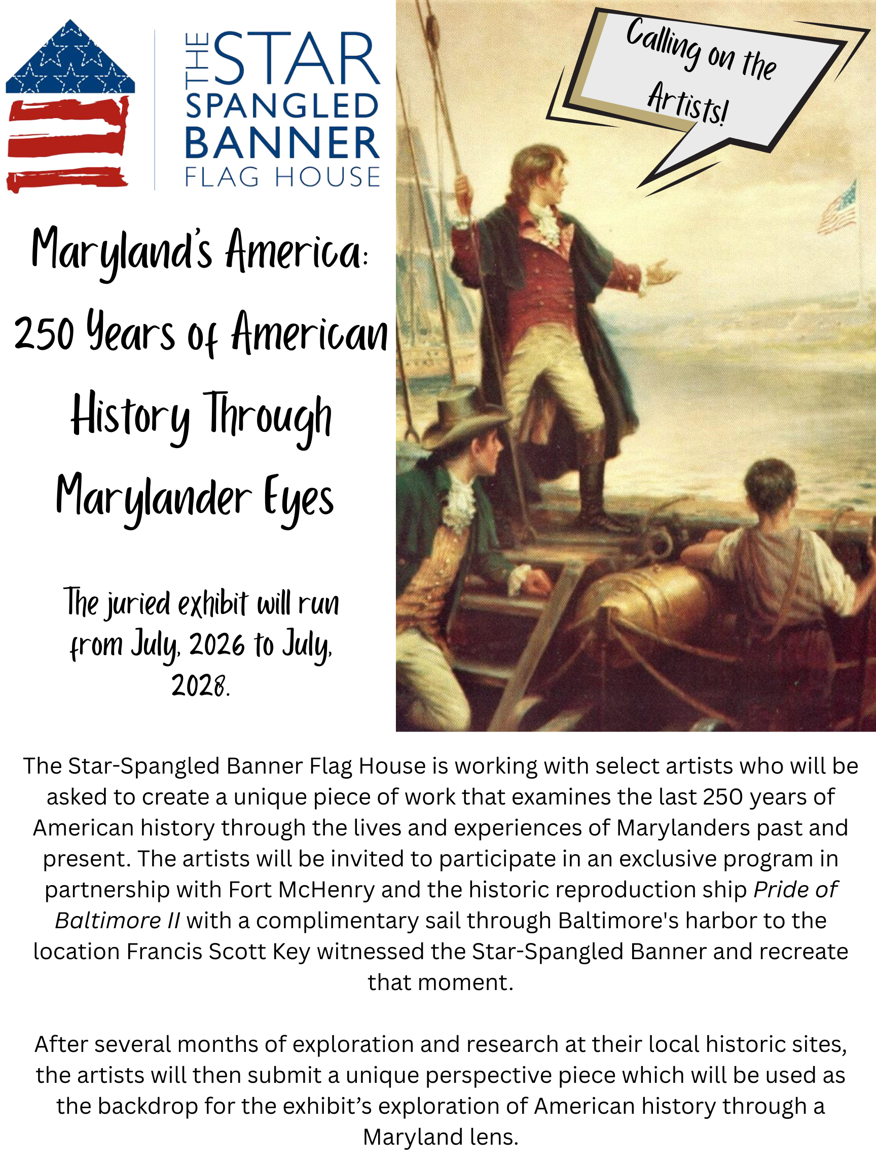 The Flag House is designing a two-year exhibit where eight Maryland artists representing their communities across the state will provide historical witness through individualized work. These works will culminate in a dynamic museum exhibit that coordinates public programming in commemoration of America’s Semiquincentennial. “Maryland’s America” will reflect on the ongoing evolution of American democracy, Maryland’s integral role in that process, and the impact of Marylanders on our nation’s past, present, and future. The Flag House is working with Adler Display to fabricate the exhibit and showcase the submitted final work to create a comprehensive story of the nation’s history from a Maryland perspective. The museum’s permanent exhibit, which was also designed by Adler Display, highlights female entrepreneurship in early America through the struggles and successes of the Young-Pickersgill family who were contracted to sew the original Star-Spangled Banner.