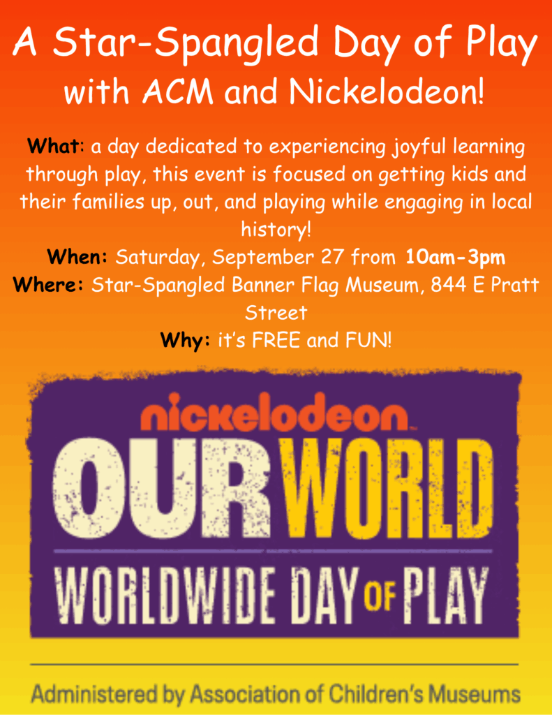 In cooperation with Nickelodeon and the Association of Children’s Museums, the Star-Spangled Banner Flag House is hosting a free event day meant to get families outside and moving together. Explore historical games and crafts at the Flag House from 10am-3pm on September 27th. All entry and participation is free.