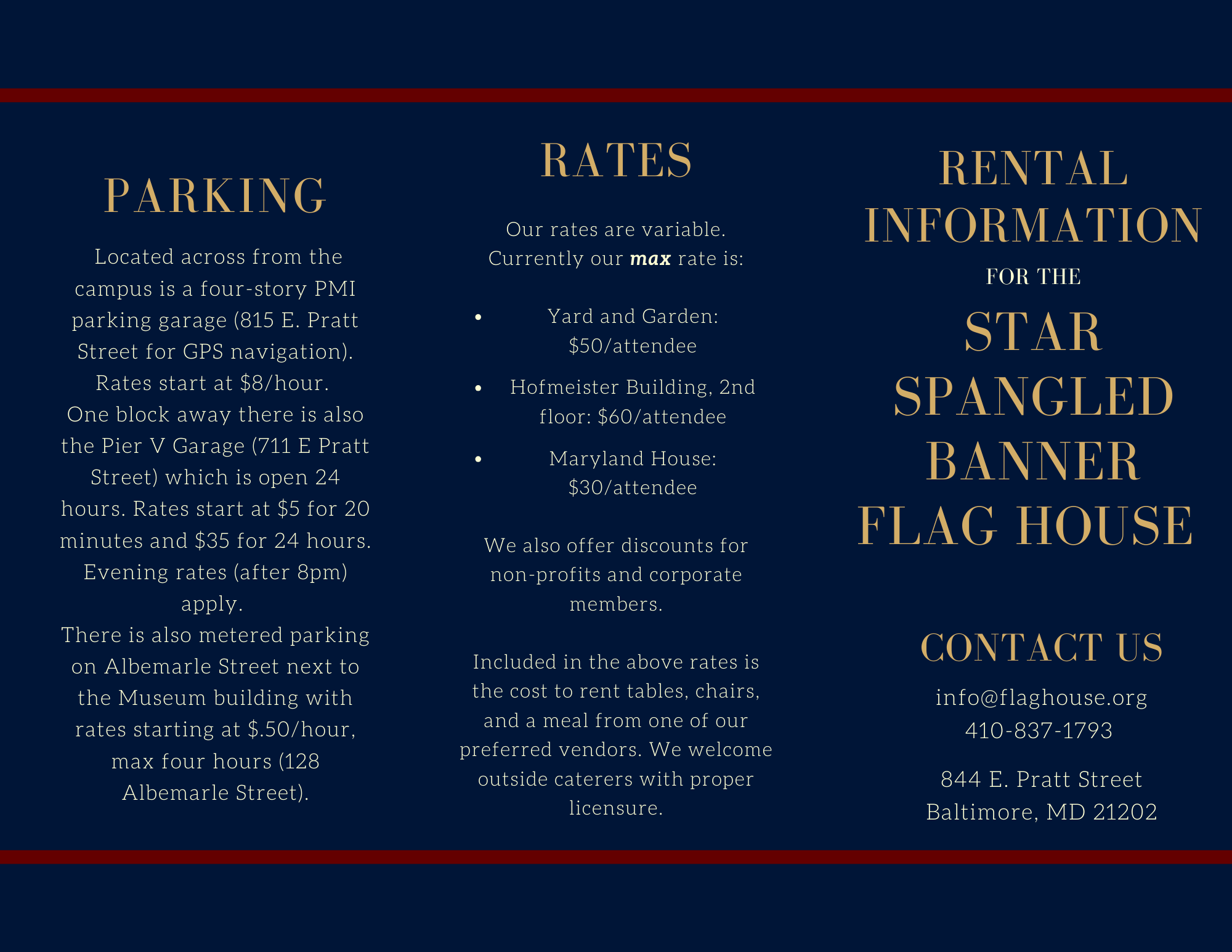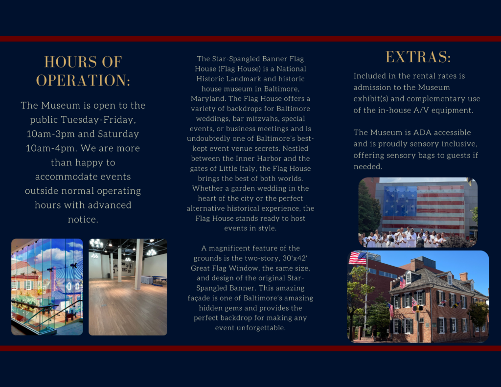 The Star-Spangled Banner Flag House offers a variety of backdrops for your Baltimore wedding, bar/bat mitzvah, special event or business meeting and is undoubtedly one of Baltimore’s best-kept event venue secrets. Nestled between the Inner Harbor and the gates of Little Italy, the Flag House brings the best of both worlds. Whether a garden wedding in the heart of the city or the perfect alternative historical experience in our newly renovated event hall, the Flag House stands ready to host your event in style.