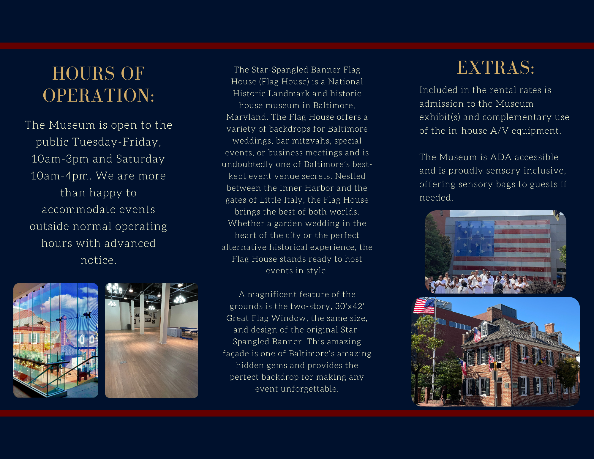 A magnificent feature of the grounds is the two-story Great Flag Window, the same size, and design of the original Star-Spangled Banner. This amazing façade is one of Baltimore’s iconic spaces and provides the perfect backdrop for any function, large or small.